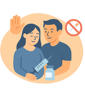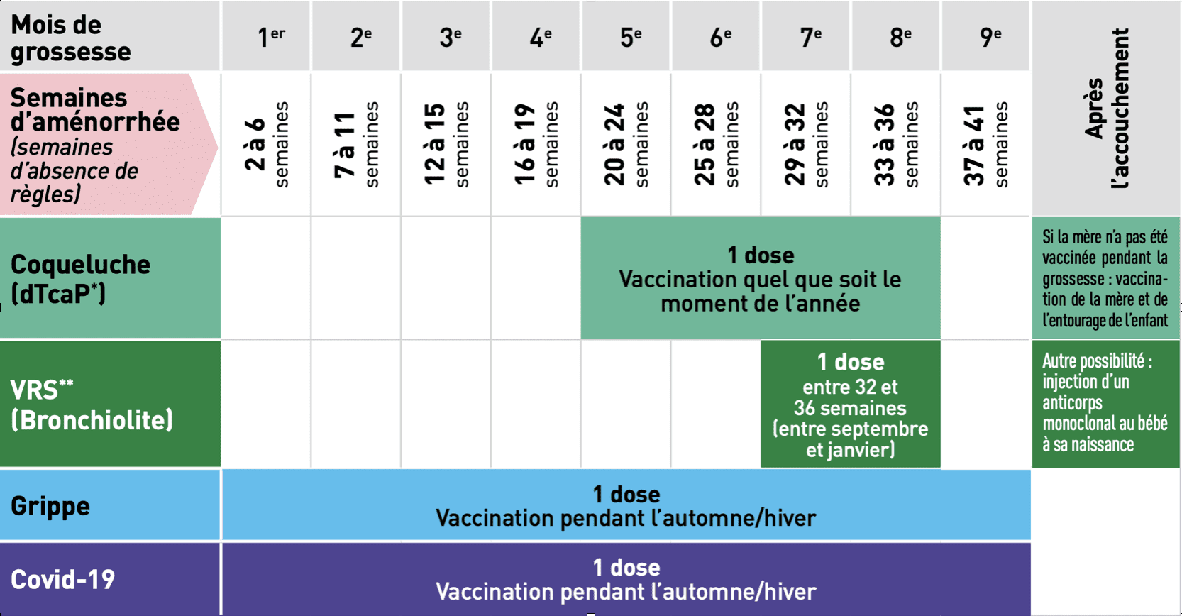 - Pendant la grossesse : vaccination contre la grippe, le Covid 19, la coqueluche et le VRS